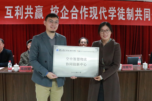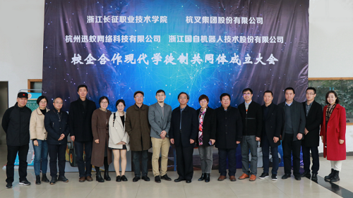 会上,校企共同签订了现代学徒制培养协议,学校分别授予了三家企业“校企协同培养应用性人才基地”牌。杭叉集团股份有限公司授予了智能技术系电子信息工程技术专业“现代学徒制杭叉智能制造班”牌,杭州迅蚁网络科技有限公司授予了智能技术系无人机应用技术专业“现代学徒制迅蚁科技班”牌,浙江国自机器人技术股份有限公司授予了智能技术系工业机器人技术“现代学徒制国自机器人班”牌,同时,学校和杭州迅蚁网络科技有限公司合作成立了“空中智慧物流无人机创新协同中心”。