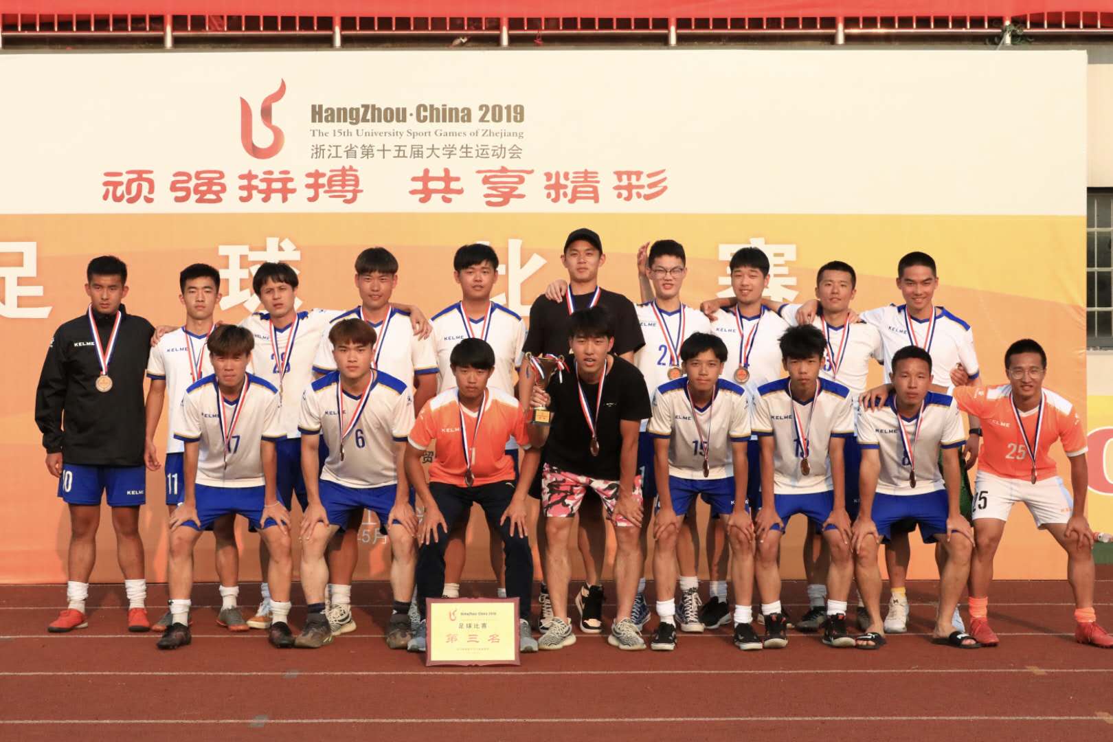 日前,浙江省第十五届大学生运动会足球比赛(男子乙组)顺利闭幕。经过36场比赛的激烈角逐,我校男子足球队斩获季军奖杯。