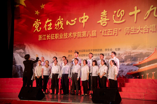 5月10日下午,为迎接党的十九大,纪念中国共青团成立九十五周年,浙江长征职业技术学院以“党在我心中,喜迎十九大”为主题的第八届“红五月”师生大合唱比赛在学院体育馆隆重举行。
