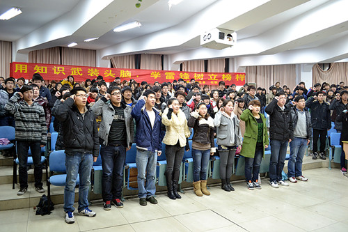 影片结束后,在场所有人起立宣誓,纷纷表示在将来的学习和生活中会学习雷锋,以身作则,热爱祖国,热爱党,热爱集体,助人为乐,勇于奉献,艰苦朴素,勤俭节约,努力创建和谐社会,将雷锋精神化为我们的道德准则、行为模范,以实际行动为新时代的雷锋精神注入新的内涵。