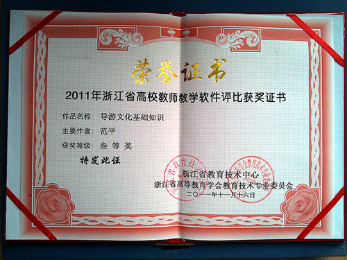 从浙江省高等教育学会教学技术委员会获悉,在第八届浙江省高校教师教学软件评比中,我院选送的管理系教师范平制作的《导游文化基础知识》多媒体教学软件荣获三等奖。本次竞赛全省有50所院校选送266件作品参加评比,我院是第二次选送作品参赛,在相关院领导、职能部门的重视下,各系、部教师积极参于,不仅获得三等奖,更主要的是通过参赛,强化了我院教师多媒体教学软件创作、使用意识,宣传了多媒体教学软件制作规范,有利于促进我院多媒体网络课程建设。