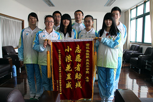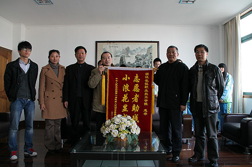 12月5日上午,浙江省残联党委副书记张阳成、浙江省残疾人体育训练指导中心主任田晓顺、浙江省特殊教育学校副校长王金林来到我院,代表八届残运会象棋单项竞委会对我院“小浪花”在赛事期间提供的优质服务给予高度评价,赞扬他们用实际行动继承和发扬了“奉献、友爱、互助、进步”的志愿精神,为残运会的顺利进行做出了重大贡献,向我院领导对志愿者工作的支持表示感谢,并赠送我院“志愿者助残,小浪花显威”的锦旗。我院党委副书记洪骏、团委书记陶元以及志愿者代表接受锦旗。