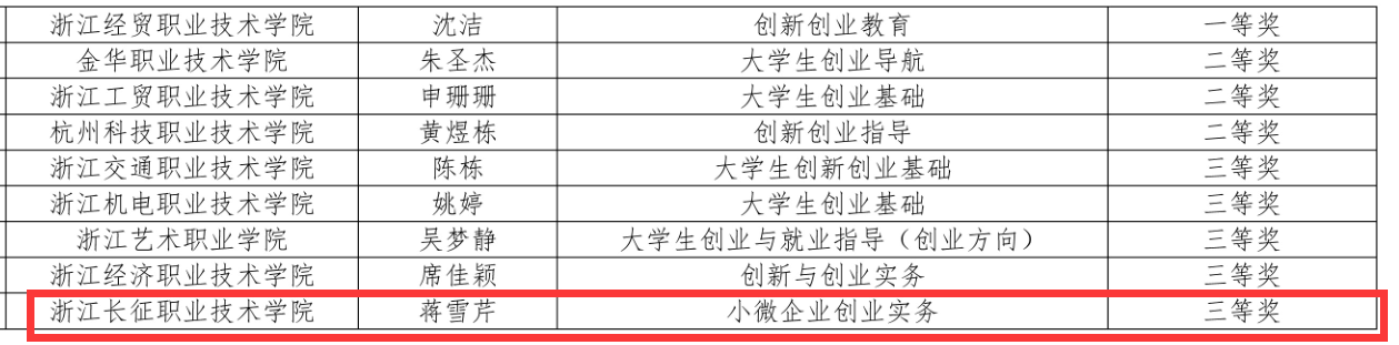 近日,浙江省高教学会公布了第三届高校教师教学创新大赛就业创业指导课程教学专项赛(以下简称“大赛”)的获奖名单,学校管理学院蒋雪芹老师在大赛中荣获高职创业组三等奖。