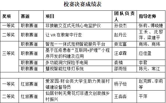 此次比赛自筹备以来,历时2个月,共有来自全校各二级学院的33支团队参加了比赛,比赛分现场答辩与专家提问多个环节,经过激烈角逐,大赛评选出职教赛道:一等奖一名、二等奖一名、三等奖四名和优秀奖若干名;红旅赛道:一等奖一名,二等奖一名。