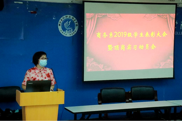 近日,商务系在第一教学楼1117室召开了2019级优秀学生表彰大会暨顶岗实习动员会。商务系主任李庆海、党总支书记过芹芹、教师代表及2019级优秀学生代表参加了此次会议。会议由商务系教学秘书史晓懿主持。