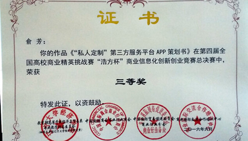 我院钟燕老师、李慧刚老师、张崇利老师和王立研老师指导的商务系14市场营销专业俞芳同学团队的作品《“私人订制”第三方服务平台APP策划书》、会计系14会计专业应罄鑫同学团队的作品《4D试衣间策划书》两个项目在众多项目中脱颖而出,分别各获得三等奖的好成绩。四位老师获得优秀指导教师奖。