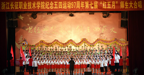 红歌唱响延安精神,党旗飞扬百年辉煌。2016年5月4日下午,我院在体育馆隆重举行了以“唱经典赞歌,传承五四薪火”为主题的浙江长征职业技术学院第七届“红五月”师生大合唱。大合唱邀请了周边共建单位以及各兄弟院校的声乐指导老师担任评委。学院执行院长、正院级巡视员洪永铿,学院副院长杜宝山,党委副书记、副院长王其军,党委委员、工会主席洪骏,党委副书记、纪委书记张乐弟等学院领导出席本次活动。现场1000多名师生一起观看了比赛。