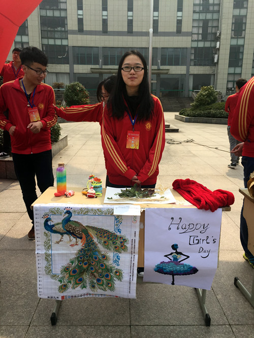 3月14日中午,女生节系列活动之“才女其姝”在图书馆前顺利进行。学生自己创作的各式工艺品在此得到展示,有绘画、书法、十字绣及DIY创意作品等。