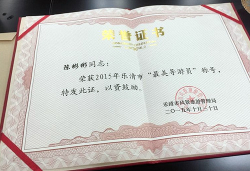 我院管理系15届毕业生陈彬彬被乐清市风景旅游管理局评为“十佳最美导游员”