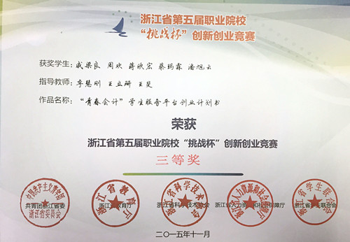 浙江省第五届职业院校“挑战杯”创新创业竞赛于2015年6月启动,经校赛选拔,我院有7个项目参加省赛,在决赛环节中经过集中答辩、公开答辩,我院参赛项目竹丹婷、林笑笑、徐梦君三位同学的作品《“鲜活记忆,停驻美好”——Green Dream旧物回收改造铺》(指导老师吴晓涵)荣获浙江省第五届职业院校“挑战杯”创新创业竞赛二等奖,此外,戚梁良、周欢、蒋欣宏、蔡玛霖、潘旭云五位同学的作品《“青春会计”学生服务平台创业计划书》(指导老师李慧刚、王立研、王斐)和彭李铸、上官文雅、周瑞鹏三位同学的作品《游戏文化周边》(指导老师贺学贵、姜继红)荣获浙江省第五届职业院校“挑战杯”创新创业竞赛三等奖。