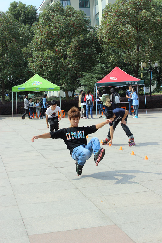 这边欢声笑语不时地从英语协会报名点传出;那边轮滑社的表演者们展示着接龙,平花,刹车、倒滑等各种高难度动作;一个连转360度更是将整个表演推向高潮,引来阵阵欢呼声、赞叹声、掌声;环保协会成员们则每人手持宣传单页为新生提供关于协会的详细介绍,帮助新生进一步了解环保协会。
