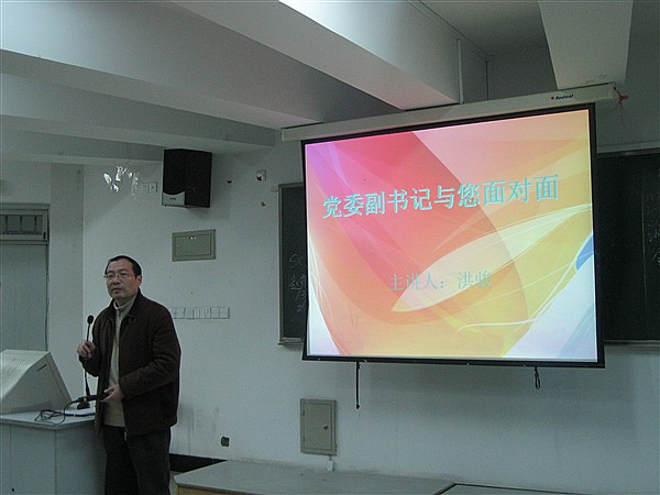 2010年12月13日晚上,我院在1218教室举办了“党委副书记与你面对面”主题座谈会。学院党委副书记洪骏老师主持了本次座谈会。
