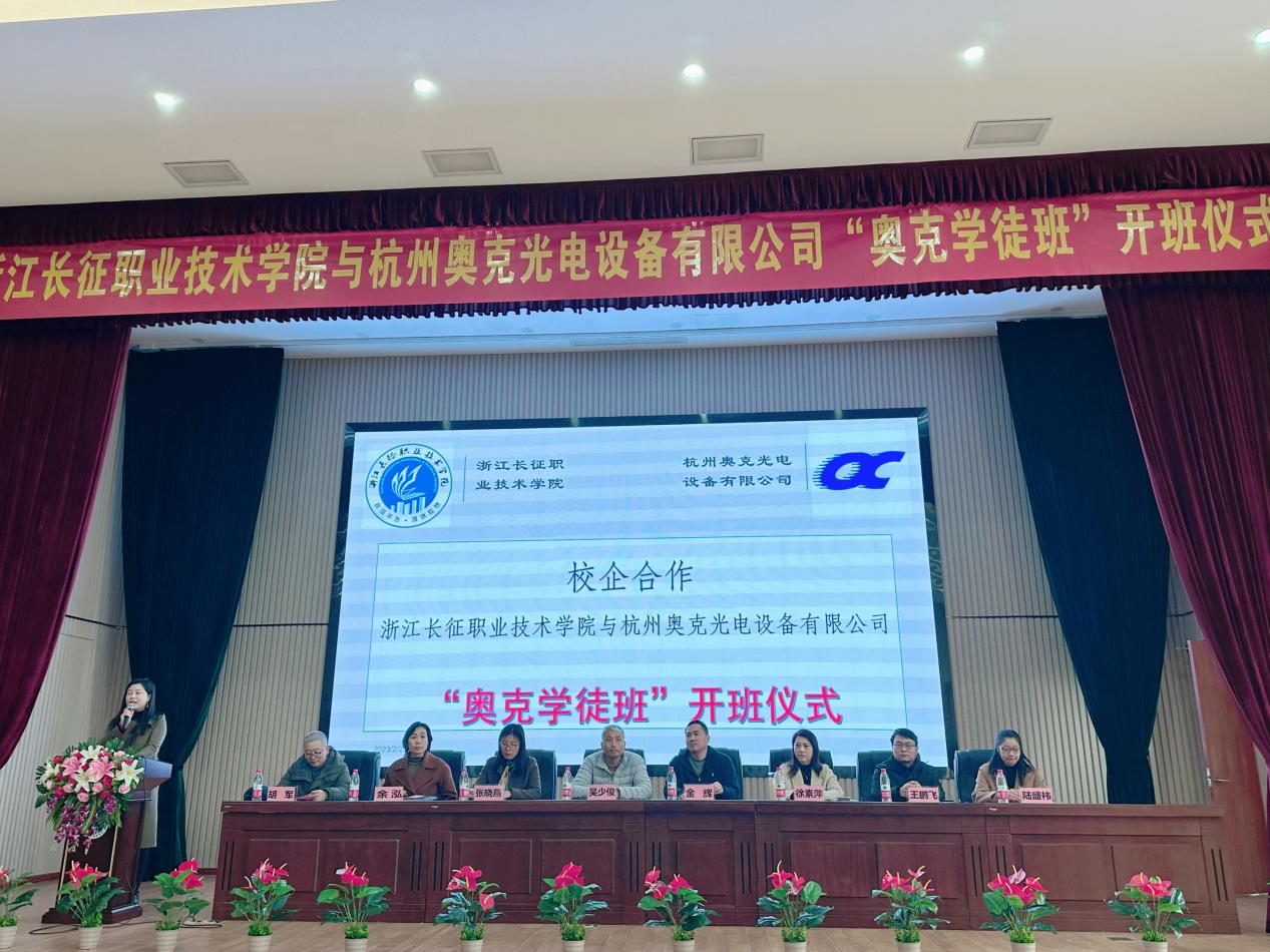 近日,浙江长征职业技术学院与杭州奥克光电设备有限公司“奥克学徒班”开班仪式在第二报告厅顺利举行。杭州奥克光电设备有限公司董事长金辉、副总经理徐素萍、总工程师王鹏飞、人事部总监陆盛祎、筹备专员汤德民、戴政旭,学校教务处副处长吴少俊,智能技术学院副院长张晓燕、党总支副书记余泓,物联网应用技术专业教研室主任胡军,电子信息工程技术专业教研室主任李君等及物联网应用技术专业学生参加了此次开班仪式。