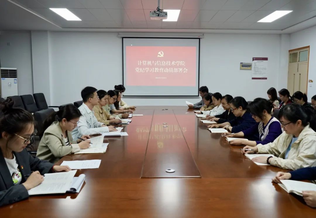 为贯彻落实习近平总书记关于开展党纪学习教育的重要讲话和重要指示精神,根据学校党委关于在全校开展党纪学习教育的相关要求,近日,计算机与信息技术学院党总支在图书馆308室召开了党纪学习教育动员部署会。学院党总支书记徐静、副书记刘帅,全体党员参加了此次会议。