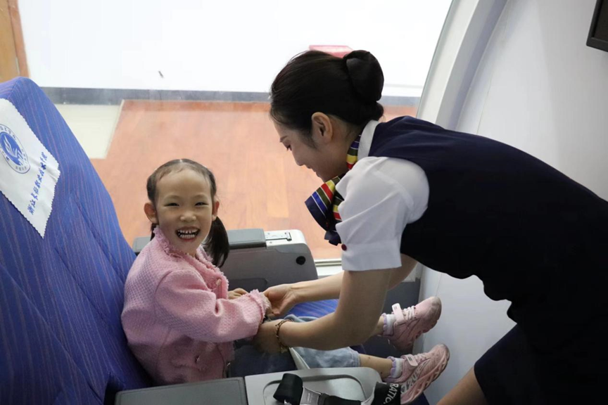 在参观、授课过程中,空中乘务专业教师根据幼儿特点采用生动有趣的问答方式,与小朋友们进行互动,为孩子们介绍了机场的基础构建,如塔台的作用、跑道的使用等,将航空通用知识寓教于乐。在体验中,无论是飞机的内外部构造,还是飞机上应急设备的使用方法,都牢牢抓住了小朋友们的兴趣关注点。