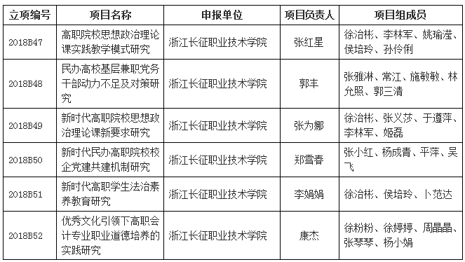 据浙江省高职院校党建研究会 浙江省高校思想政治教育研究会高职分会文件《关于公布2018年研究会科研项目立项的通知》(浙高职党研【2018】7号),全省共有27个项目获重点项目立项,56个获一般项目立项。立项项目中,我校有7位老师主持的项目获得立项。其中,潘雅辉老师获重点项目立项,张红星等6位老师获一般项目立项。具体项目如下: