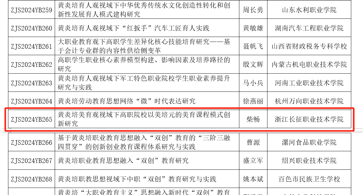 2024年3月4日,中华职业教育社公布了第二届黄炎培职业教育思想研究规划课题立项名单,浙江长征职业技术学院管理学院骆王丽老师的《黄炎培育人观视阈下高职拔尖创新人才培养研究》(课题编号:ZJS2024YB080)和商贸学院柴畅老师的《黄炎培美育观视域下高职院校以美培元的美育课程模式创新研究》(课题编号:ZJS2024YB265)成功立项。