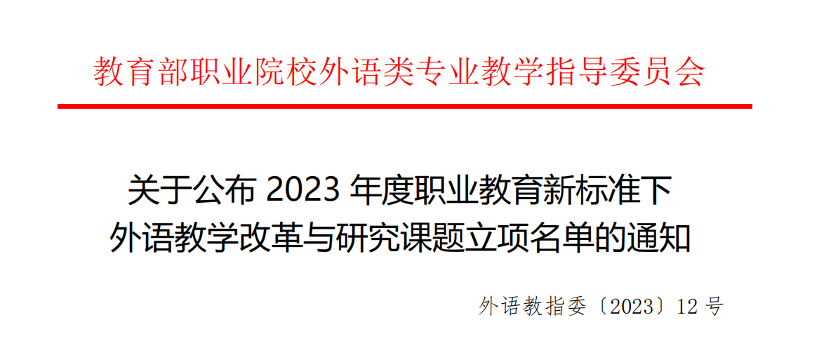 11月1日,教育部职业院校教育指导委员会公布2023年度职业教育新标准下外语教学改革与研究课题立项名单,学校人文与教育学院公共外语教研室杨成青教授申报的《内容语言融合理论应用于高职英语教学的行动研究》获得重点课题立项(项目编号:WYJZW-2023ZJ0004)。